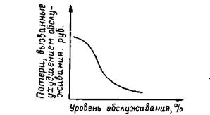 С другой стороны, снижение уровня обслуживания ведет к увеличению потерь, вызванных ухудшением качества сервиса. Эта зависимость также может быть представлена графически.