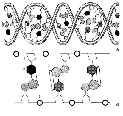 Рис. 2.2. Схема строения молекулы ДНК в виде двойной спирали (а) и прямой лесенки (б) (по В. Олфри и А. Мирскому).
