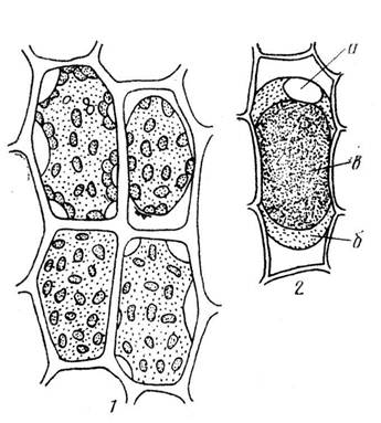 1 – последовательные этапы плазмолиза в клетках листа мха, 2 – выпуклая форма плазмолиза (колпачковый плазмолиз) в клетке эпидермиса чешуи лука с окрашенной антоцианом вакуолью: а – ядро, б – цитоплазма, в – вакуоль (по Д. А. Сабинину – цит. по С. И. Лебедеву).