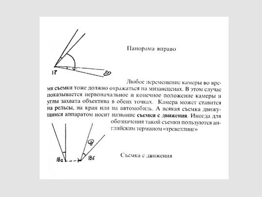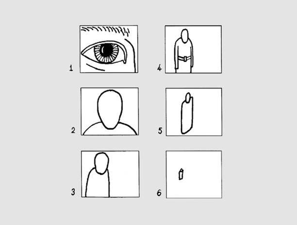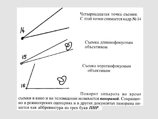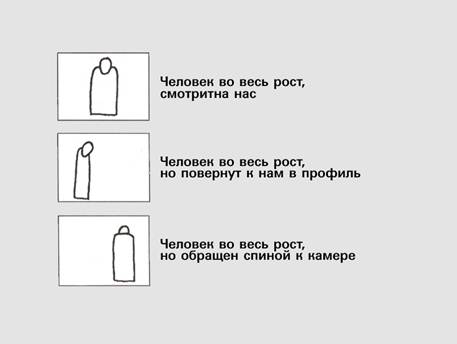 Каждый режиссер и оператор должны уметь графически показать друг другу, что они хотят увидеть в кадре – крупность, ракурс. Посмотрел ассистент в раскадровку и все понял, что от него требуется для подготовки к съемке следующего кадра. Для достижения определенной точности в изображении кадра и возможности представить будущий результат съемки на экране обязательно пользуются начертанием сцены в двух проекциях: условным изображением объектов в рамке кадра (с точки зрения камеры) и планом съемочной площадки, на котором рисуются условные обозначения действующих лиц, главных предметов, точки съемки (места расположения камер) и углы захвата объективами части пространства, попадающего в кадр с каждой точки.