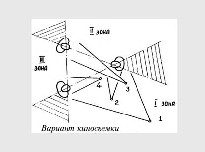 Если камеры располагать на точках, лежащих по одну сторону от линии взаимных взглядов друг на друга, то у зрителя, смотрящего на экран, картинка в голове сложиться, как если бы сам наблюдал в жизни это событие своими глазами.