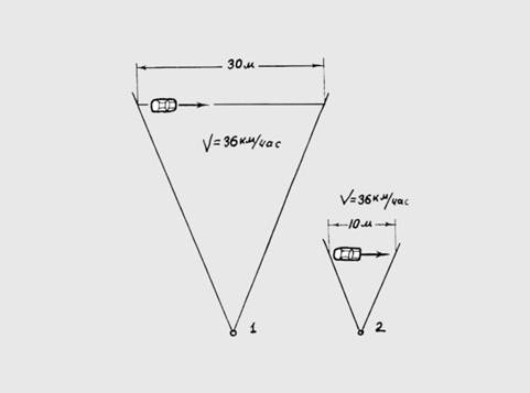 Автомобиль движется с одинаковой скоростью, а впечатление, что во втором кадре скорость возросла в два раза. Причем изменилась мгновенно, «по-щючьему велению», без каких-либо объективных причин. Но если внимательно приглядеться, можно догадаться где была совершена ошибка. Просто путь который проделал автомобиль, чтобы пересечь кадр в первом случае в три раза длиннее, чем во втором. При одной и той же скорости, в первом кадре машина преодолевает расстояние от рамки до рамки - за три сек, а во втором - за одну. Для зрителя это расстояние одинаково, а время сократилось втрое. Кроме того, увеличение масштаба съемки, при котором корпус машины занял большую площадь экрана, усугубляет ощущение моментального возрастания скорости. Можно, конечно, улучшить восприятие если дать машине выехать за рамку в первом кадре, но сохранить впечатление, что в действиях главного объекта ничего не изменилось, все равно не удастся. Что делать?