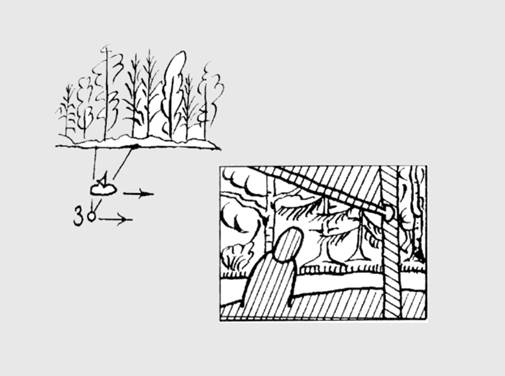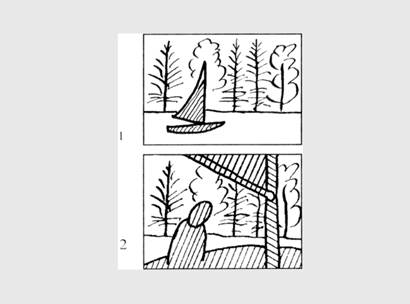 Рассмотрим второй вариант, когда два соседних плана снимаются панорамой сопровождения. Объект по отношению к рамкам кадра почти неподвижен. Перемещается только фон относительно нашего объекта. Пусть таким объектом станет яхта и шкипер. Поставили камеру на первую точку и сняли яхту на фоне леса, панорамирую камеру по мере движения судна. Камера стояла на берегу, удобство съемки максимальное. Но во втором кадре нужно снять действия яхтсмена. Меняем фокусное расстояние до 2-го среднего плана и снимаем стой же точки.