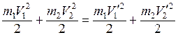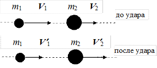 В случае прямого центрального удара векторы скоростей шаров до и после удара лежат на прямой, соединяющей их центры. Проекции векторов скорости на линию удара равны модулям скоростей. Их направления учтем знаками: положительное значение припишем движению вправо, отрицательное – движению влево. При указанных допущениях законы сохранения имеют вид