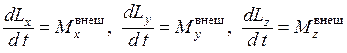 которые получаются из уравнения (4.4) путем проектирования на неподвижные оси декартовой системы координат. Индекс «внеш.», указывающий на то, что при вычислении момента сил внутренние силы могут не приниматься во внимание, в дальнейшем обычно будет опускаться. Таким образом, под М в уравнении моментов всегда будет подразумеваться момент внешних сил. Величины Lx и Мх называются соответственно моментами импульса и сил относительно оси Х. Аналогично говорят о моментах импульса и сил относительно координатных осей Y и Z.