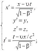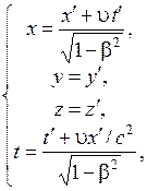 3. В закон преобразования координат входит время, а в закон преобразования времени – пространственные координаты (устанавливается взаимосвязь пространства и времени).