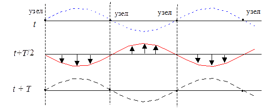 На рис. 7.4. изображено колебание стоячей волны в различные моменты времени, отличающиеся на пол-периода. Стрелками показаны скорости частиц.