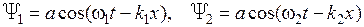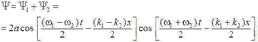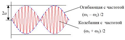 , которая очень близка к частоте любой из двух компонент. Амплитуда волны, имеющая максимальное значение 2 a, модулирована в пространстве и времени очень медленно меняющейся огибающей с частотой