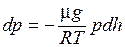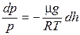 Пусть поле тяготения однородно, температура постоянна и масса всех молекул одинакова. Если атмосферное давление на высоте h равно р, то на высоте h+dh оно равно p+dp (при dh>0 и dp<0, так как давление с высотой убывает). Разность давлений р и p+dp равна весу газа, заключенного в объеме цилиндра высотой dh с площадью основания, равной единице площади: