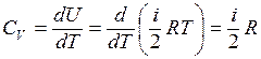 не зависит от вида процесса (внутренняя энергия идеального газа не зависит ни от p, ни от V, а определяется лишь T) и всегда равна CV. Дифференцируя уравнение состояния идеального газа для 1-го моля pV=RT по T (p = const), получаем