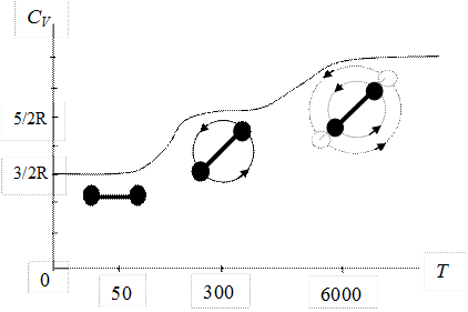 При достаточно малой температуре движение молекулы водорода между столкновениями подобно поступательному движению твердого тела. Когда температура повышается, включаются вращательные степени свободы и картина движения молекулы несколько изменяется – молекула в процессе прямолинейного движения между столкновениями вращается. При дальнейшем повышении температуры включаются колебательные степени свободы и движение молекулы еще более усложняется, поскольку в процессе поступательного движения составляющие ее атомы колеблются вдоль оси, изменяющей свою ориентацию в пространстве.