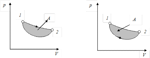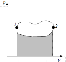 На p – V диаграмме циклический процесс изображается замкнутой кривой (рис. 9.8). Точки 1 и 2 соединяются двумя различными кривыми. Производимая системой работа при переходах из одного состояния в другое измеряется площадью под соответствующей кривой. Если циклический процесс происходит по направлению часовой стрелки, то площадь ограниченная кривыми, соответствует работе, производимой системой (тепловой двигатель), а если против часовой стрелки, то во время процесса работа совершается над системой (холодильники и тепловые насосы).
