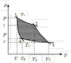 Площадь, заключенная между кривыми 1-2-3 (рис. 9.10) и осью абсцисс, соответствуют механической работе, произведенной газом при расширении, а площадь, заключенная между кривыми 3-4-1 и осью абсцисс, соответствует механической работе, затраченной на сжатие газа. Разность обеих площадей дает механическую работу, произведенную во время цикла. Отсюда следует, что количество теплоты