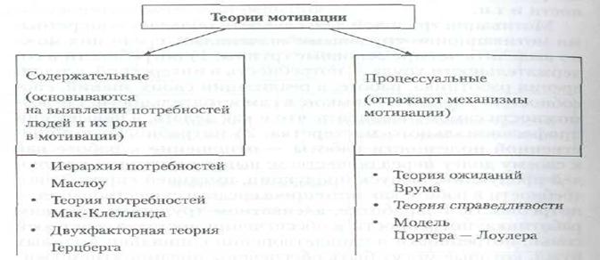 Различают содержательные теории мотивации, основывающиеся на том, что существуют внутренние побуждения (потребности), которые заставляют человека действовать, и процессуальные теории мотивации, которые определяют не только потребности, но и исходят из восприятия и ожиданий человека, связанных с данной ситуацией, и возможных последствий выбранного типа поведения.