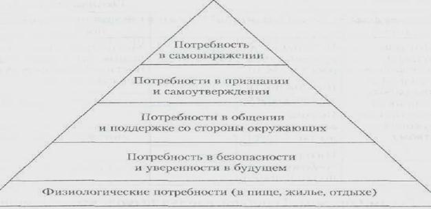 В соответствии с теорией иерархии потребностей американского социолога А. Маслоу люди постоянно испытывают различные потребности, которые можно объединить в группы, находящиеся в иерархическом отношении друг к другу. А. Маслоу выделил пять таких групп и расположил их в виде пирамиды (рис. 6.5).
