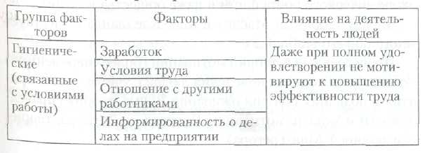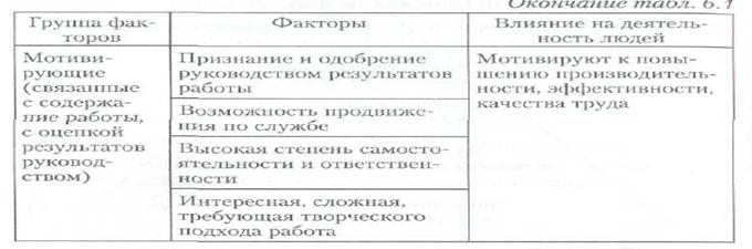 Автор созданной в конце 1950-х гг. двухфакторпой модели ф. Герцберг показал, что на деятельность людей оказывают влияние две группы факторов, названные им гигиеническими и мотивирующими (табл. 6.1).
