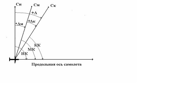 В зависимости от какого меридиана ведется отсчет, курс самолета может быть истинным (ИК), магнитным (МК), компасным (КК).