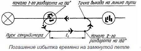 Для погашения избытка времени этим способом определяют избыток времени Δ t. Затем у характерного ориентира делают разворот на 180°. В конце разворота пускают секундомер. С обратным курсом следуют в течении