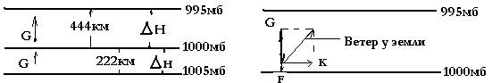 Как только создается разность атмосферного давления в горизонтальном направлении, сейчас же возникает сила барического градиента, под действием которой частицы воздуха начинают перемещаться из области более высокого в область более низкого давления. Эта сила всегда направлена перпендикулярно к изобаре в сторону низкого давления. Чем гуще изобары, тем больше градиент давления. G 1=(5 мб х 111) / 444 км=1.25 мб; G 2 =(5 мб х 111) / 222 км=2,5 мб.