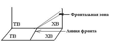 Граница между воздушными массами по горизонту – называется линией фронта, граница между воздушными массами по вертикали – наз. фронтальной зоной. Фронтальная зона всегда наклонена в сторону холодного воздуха. В зависимости от того, какая ВМ приходит – теплая или холодная различают теплый ТФ и холодный ХФ фронты.