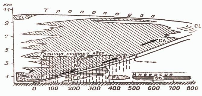 Характерной особенностью фронтов является наличие наиболее опасных (сложных) метеорологических условий для полета. Фронтальные облачные системы отличаются значительной вертикальной и горизонтальной протяженностью. На фронтах в теплое время года наблюдаются грозы, болтанка, обледенение, в холодное время – туманы, снегопад, низкая облачность.