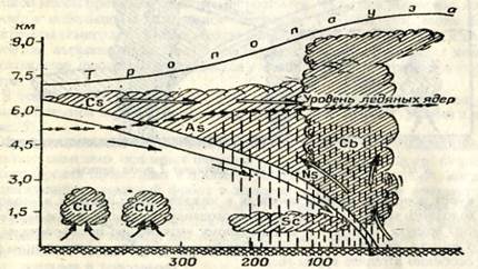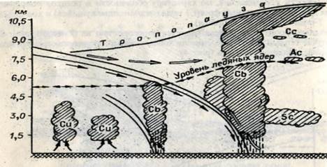 При движении в более теплый район холодная ВМ нагревается снизу и становится неустойчивой ВМ. Мощные восходящие движения воздуха способствуют образованию кучево-дождевой облачности с ливневыми осадкаи, грозами.