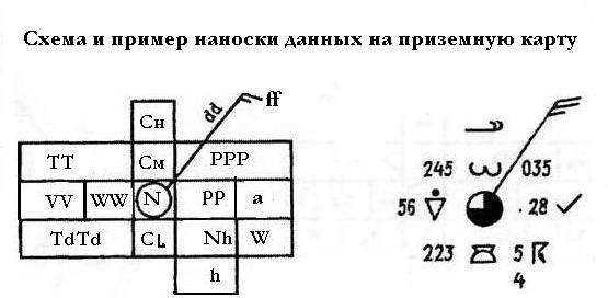 На синоптические приземные карты погоды вокруг кружка (пункта) станции часть данных наносится цифрами, а часть — условными знаками. Цифрами наносятся следующие данные: