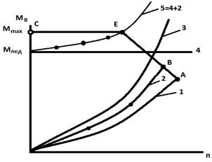 Прямая 4 – это момент сопротивления при взаимодействии винта со льдом (без хода). Кривая 5 – это суммарный момент характеристик 2 и 4.