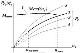 Зависимости Me= f (ne) и Pe= f (ne) при номинальном режиме работы называют внешними характеристиками (кривые 1 и 2). А при меньшей подаче топлива (кривые 3 и 4) – называют частичными характеристиками. Дизели допускают кратковременную перегрузку по мощности до 15% при увеличенной подаче топлива (кривая 5). При частотах вращения менее n крит (минимальной устойчивой) дизель не может работать и нести нагрузку.
