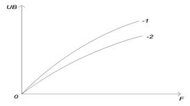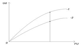 Коэффициент усиления машины постоянного тока – это отношение выходного сигнала – напряжения на якоре, но входному напряжению на обмотке возбуждения. У генераторов постоянного тока коэффициент усиления и быстродействие – невелики. Применение ЭМУ поперечного или продольного поля в качестве возбудителя позволяет увеличить быстродействие и коэффициент усиления, т.е. можно уменьшить мощность входного сигнала. Характеристика ЭМУ имеет вид, показанный на рисунке 5.5.