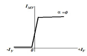 Такой МУ включает рабочие обмотки РО и обмотки управления ОУ1 и ОУ2. МУ с внутренней обратной связью в каждый полупериод задерживает прохождение фазного тока на некоторый угол α=ωt. Эта задержка создается и регулируется током управления I у, который подмагничивает сердечники. Зависимость выпрямленного тока магнитного усилителя I МУ от тока управления имеет вид, показанный на рисунке 5.7.