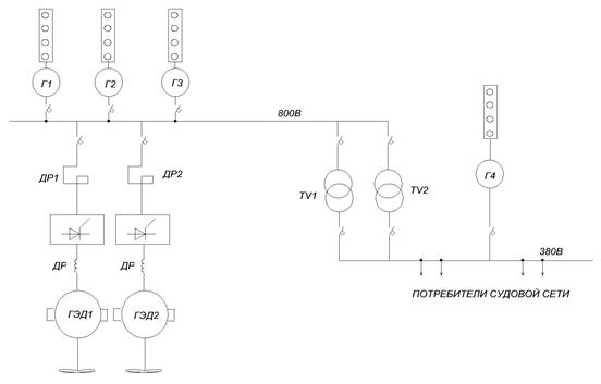 Дизель-генератор Г1-Г2 вырабатывают напряжение 800В. Судовые потребители получают питание 380В через понижающие трансформаторы TV1 и TV2. Кроме того к шинам судовой сети 380В подключен резервный дизель-генератор Г4.