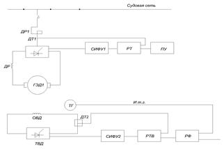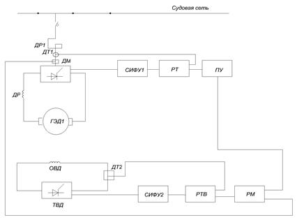 Схема содержит: регулятор тока двигателя – РТ; регулятор тока возбуждения двигателя – РТВ; регулятор магнитного потока двигателя – РФ, который совместно с регулятором РТ служит для поддержания постоянства мощности, потребляемой ГЭД; тахогенератор – ТГ; датчики тока ДТ1 и ДТ2, пост управления ПУ и системы импульсно-фазового управления вентилями – СИФУ1 и СИФУ2.