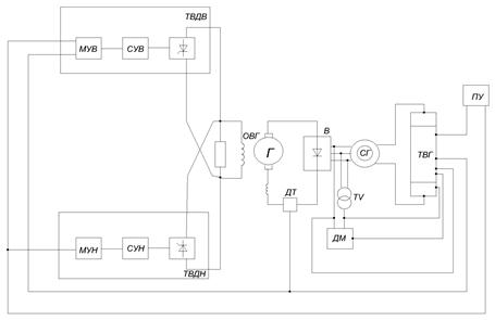 Схема включает: синхронный генератор СГ; силовой неуправляемый вентиль В; гребной электродвигатель ГЭД, тиристорный возбудитель генератора ТВГ системой управления; тиристорные возбудители двигателя для хода вперед – ТВДВ и для хода назад – ТВДН; системы управления и магнитные усилители возбудителей двигателя для хода вперед – МУВ и СУВ и для хода назад – МУН и СУН; обмотку возбуждения двигателей ОВД, трансформаторы напряжения – ТV и тока ТА, которые служат датчиками для обратных связей и цепей управления, датчик мощности генератора – ДМ, датчик выпрямленного тока