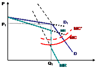 При ценах выше Р1 кривая спроса очень эластична, так как фирма полагает, что, если она поднимет цену выше Р1, остальные фирмы не последуют за ней и она потеряет значительную часть своей доли на рынке. Но если фирма снизит цену ниже Р1, остальные фирмы последуют за ней, так как не захотят терять своей доли на рынке, и поэтому сбыт расширяется только до тех пор, пока более низкая рыночная цена увеличивает совокупный рыночный спрос. Так как кривая спроса фирмы изогнута, ее кривая предельного дохода прерывается. Нижняя часть кривой предельного дохода соответствует менее эластичной части кривой спроса. В итоге издержки фирмы могут меняться, не вызывая изменения цен. Как показано на рисунке 9.7, предельные издержки могут возрасти, но будут