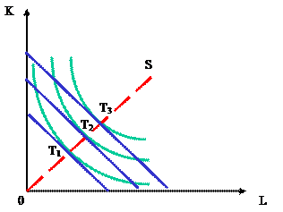 Касание изокванты с изокостой определяет положение равновесия производителя, так как позволяет достичь максимального объема производства при имеющихся ограниченных средствах. Соединив точки пересечения изоквант с изокостами, мы получим линию «путь развития» (рис. 10.3). Эта линия показывает изменение соотношения между факторами в процессе расширения производства. Форма кривой "путь развития" зависит от формы изоквант и от цен на ресурсы (соотношение между которыми определяет наклон изокост). Линия "путь развития" может быть прямой или кривой, исходящей из начала координат.