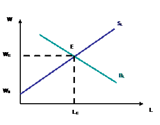 В экономической теории рынок труда – это рынок, где реализуется лишь один из прочих ресурсов. Из классической концепции следует, что рынок труда, как и другие рынки, действует на основе ценового равновесия. Основным рыночным регулятором служит заработная плата как цена рабочей силы. Зарплата гибко реагирует на потребности рынка, изменяясь под воздействием спроса и предложения, а безработица невозможна, если на рынке труда существует равновесие (рис. 12.1), где WE – равновесная зарплата; LE – численность нанимаемых работников; SL – кривая предложения труда; DL – кривая спроса на труд. Равновесная ставка зарплаты и равновесный уровень занятости данного вида труда определяются на пересечении кривых предложения и спроса на труд в точке Е.