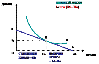 Вместе с тем следует отметить некоторые особенности, относящиеся к предложению труда. Труд – своеобразный товар. Фактически продается не наемный работник, а его рабочее время. Оно имеет естественные пределы и должно быть меньше 24 часов в сутки, так как часть времени необходима для восстановления трудоспособности человека. Индивидуальное предложение труда определяется выбором между трудом и отдыхом, так как работа сокращает продолжительность досуга. Графически это представлено на рис.12.2, где U – кривая безразличия, АВ – бюджетное ограничение «доход - свободное время», Но – свободное время, Е – точка равновесия, lо – равновесный доход.