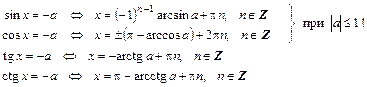 Если правая часть уравнения — отрицательное число, то следует воспользоваться свойствами соответствующих обратных тригонометрических функций, тогда: