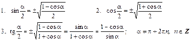 VI. Формулы половинного аргумента (знак – по функции в левой части):