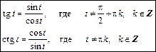 Поскольку деление на нуль невозможно, функции tg t и ctg t определены не для всех значений аргумента. Тангенс определен лишь для значений аргумента, при которых cos t ¹ 0, котангенс определен при sin t ¹ 0: