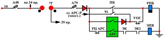 При включённых, исправных устройствах АРС и при разрешающей частоте катушка РПБ всегда находится под питанием, при этом контакт РПБ в 39 поездном проводе разомкнут и ВЗ№2 на всём составе по 39 проводу питание не получают, а контакт РПБ в цепи питания РВ2 – замкнут, что позволяет собрать схему на ход при управлении поездом от КВ.