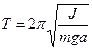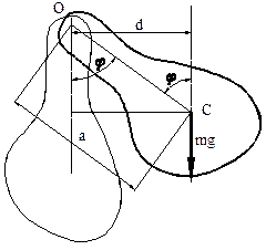 | Находится в точке С. ОС =а, - угол поворота. В точке С приложена сила тяжести, в точке О – сила реакции, она направлена вертикально вверх. Поскольку она проходит через ось вращения, то ее момент равен нулю. Вращающий момент создает сила . . Этот вращающий момент стремится вернуть тело к положению равновесия. |
