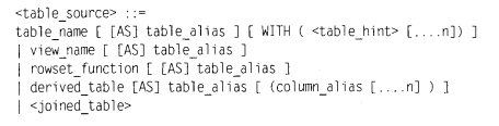 rowset_function [ [AS] table_alias]. Этот блок предполагает использование функций ROWSET (CONTAINSTABLE, FREETEXTTABLE, OPENQUERY и OPENROWSET). С помощью этих функций можно подготовить набор данных, который может быть использован вместо таблицы или представления. Дополнительно можно указать псевдоним, позволяющий обращаться к данным.