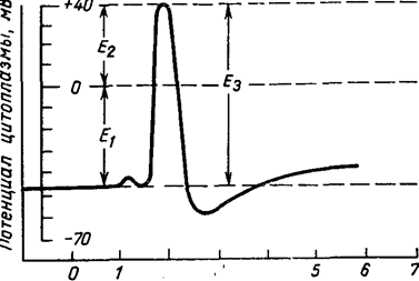 Е1 — потенциал покоя, E 2 — мембранный потенциал при возбуждении, E3 - потенциал действия.
