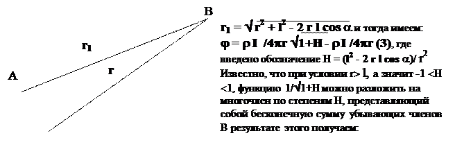 Для любой точки В, находящейся на произвольном расстоянии r от положительного униполя, по закону Ома в дифференциальной форме: djу = - Jrdr (1); где jу - потенциал, J- плотность тока; r - удельное сопротивлени среды. Через сферу радиусом r и площадью поверхности 4pr2 протекает суммарнaaый ток, равный току I, выходящему из униполя. Поэтому J = I/4pr2. Чтобы найти выражение для jу, проинтегрируем уравнение (1) в пределах расстояния от r до ¥ и потенциала от jу до нуля (принимаем jу = 0 при r® ¥). В результате получаем: jу = rl /4pr. Потенциал поля отрицательного униполя равен -jу. В возбужденном миокарде всегда имеется много диполей. Чтобы найти величину потенциала создаваемого сердцем на поверхности тела, вначале найдем потенциал j электрического поля, создаваемого конечным диполем. Поместим конечный диполь отрицательным полюсом в начало координат 0. Потенциал j в точке регистрации В равен сумме потенциалов униполей: j = rI /4pr1 - rI/4pr (2), где r1 и r - расстояние между положительным полюсом А и точкой В и между отрицательным полюсом и точкой В. Обычно величина l диполя и, следовательно, r1 не известны. Поэтому j удобнее представить в виде зависимости от r, дипольного момента и угла a между направлением регистрации потенциала и направлением вектора дипольного момента. По теореме косинусов из рисунка 1 найдем: