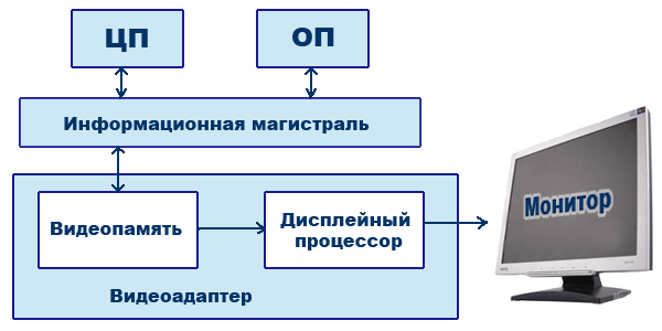 Схема показывает, что монитор (дисплей) и видеоадаптер через информационную магистраль связан с центральным процессором и