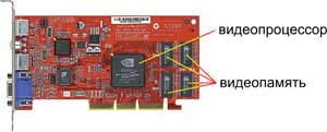 | Видеокарта располагается в системном блоке и представляет собой маленький графический компьютер со своими процессором и памятью. Видеокарта (другие названия: графическая карта, видеоадаптер) управляет работой монитора, освобождая процессор от построения кадров изображения. От качества видеокарты зависит скорость обработки видеоинформации, чёткость изображения, число цветов на экране и разрешение, в котором будет работать монитор. |