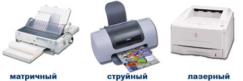 Принтеры в зависимости от порядка формирования изображения поразделяются на последовательные, строчные и страничные. Принадлежность принтера к той или иной группе зависит от того, формирует ли он на бумаге символ за символом или сразу всю строку, а то и целую страницу. По физическому принципу действия принтеры делятся на матричные, струйные и лазерные. Матричный принтер имеет печатающую головку, представляющую собой матрицу из отдельных иголочек. Таким образом, на бумаге образуются символы, состоящие из точек-отпечатков, оставляемых ударами иголочек по красящей ленте. В зависимости от конструкции печатающая головка матричного принтера может иметь 9, 18 иголок или 24 иголки. Печатающие головки струйных принтеров вместо иголок содержат тоненькие трубочки - сопла, через которые на бумагу выбрасываются капельки чернил. Печатающая головка струйного принтера содержит от 12 до 64 сопел, диаметры которых тоньше человеческого волоса. Известно несколько принципов действия струйных печатающих головок. В одной из конструкций на входном конце каждого сопла расположен маленький резервуар с чернилами. Позади резервуара располагается нагреватель (тонкопленочный резистор). Когда резистор нагревается проходящим по нему током до температуры 500 градусов, окружающие его чернила вскипают, образуя пузырёк пара. Этот расширяющийся пузырек выталкивает из сопла капли чернил диметром 50...85 мкм со скоростью около 700 км/час. В другой конструкции печатающей головки источником давления служит мембрана, приводимая в движение пьезоэлектрическим способом. В матричных и струйных принтерах электромеханичекие устройства перемещают печатающую головку и бумагу так, чтобы печать происходила в нужном месте. В отличие от матричных в струйных принтерах пишущее устройство не находится в постоянном соприкосновении с твёрдой поверхностью, а потому изнашивается не скоро и работает практически бесшумно. Важнейшей особенностью струйной печати является возможность создания высококачественного цветного изображения. В лазерных принтерах используется электрографический принцип создания изображения. Процесс печати включает в себя содание невидимого рельефа электростатического потенциала в слое полупроводника с последующей его визуализацией. Визуализация осуществляется с помощью частиц сухого порошка - тонера, наносимого на бумагу. Тонер представляет собой частички железа, покрытые пластиком. Наиболее важными частями лазерного принтера являются полупроводниковый барабан, лазер и прецизионная оптико-механическая система, перемещающая луч. Лазер генерирует тонкий световой луч, который, отражаясь от вращающегося зеркала, формирует электронное изображение на светочувствительном полупроводниковом барабане.