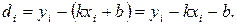 Рассмотрим математическую сторону вопроса о нахождении наилучших значений углового коэффициента k и параметра b. При выводе предположим, что ошибки содержат только значения у i (такое предположение часто оправдывается на практике), иначе анализ весьма усложнится. Отклонение экспериментального значения у i от искомой линейной зависимости в i -м измерении, то есть при х = х i, составит:
